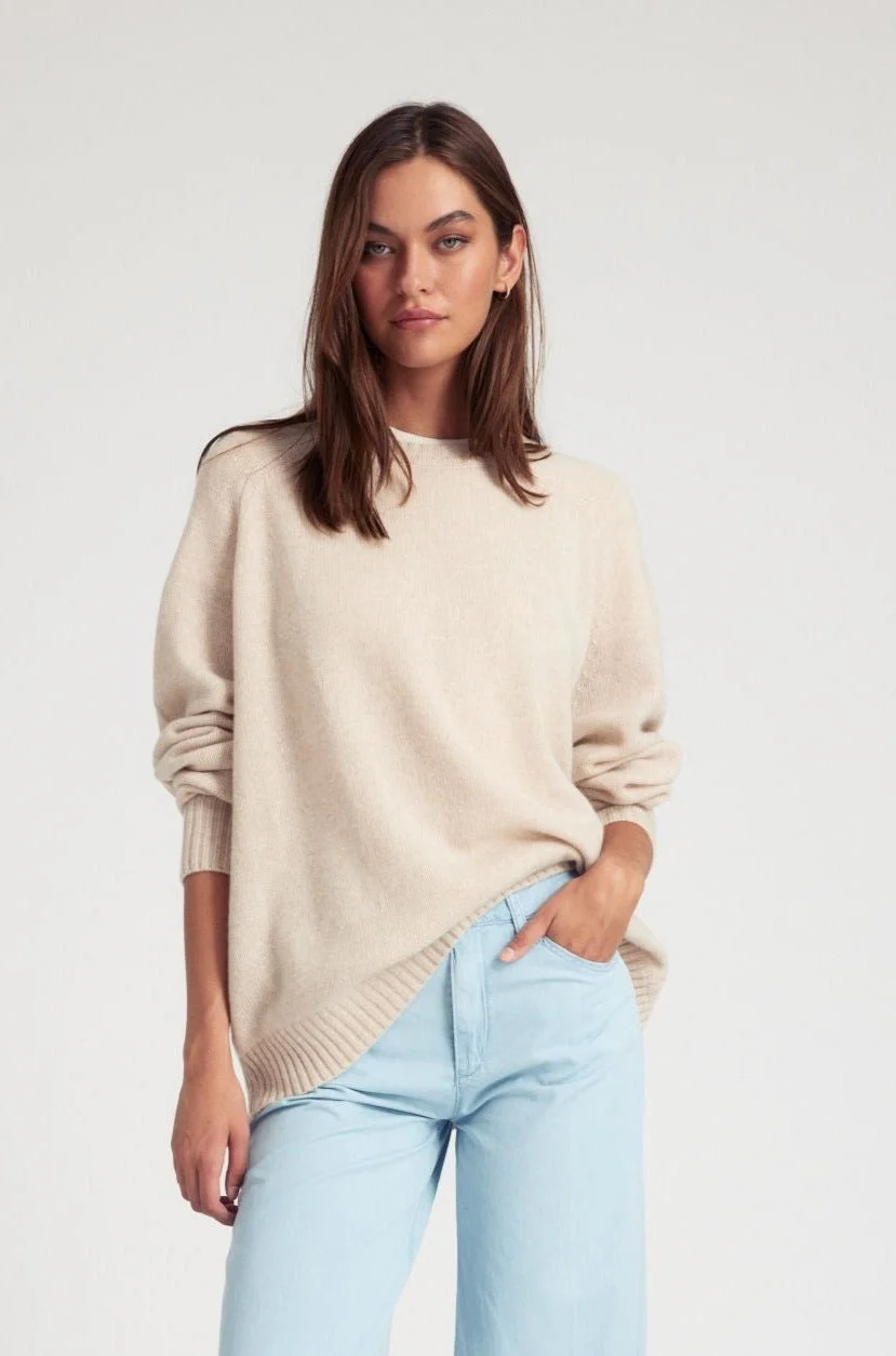 This 100% Cashmere crewneck is the perfect transition sweater; knitted from our high quality, ultra-soft Mongolian yarn with a loose gauge for ultimate breathability. It's relaxed yet timeless fit, makes it the perfect base for any outfit with room to layer underneath, as well as on top in colder months. A wardrobe classic you'll want in every color. COLOR: Oat FIT & MEASUREMENTS - Oversized fit, size down for a more fitted look - Kiana is 5'11 & wears size Small PRODUCT DETAILS - 100% Cashmere - 7 gg - Sustainably grown, organic yarn - Lightweight - Room for layering - Dry clean only
