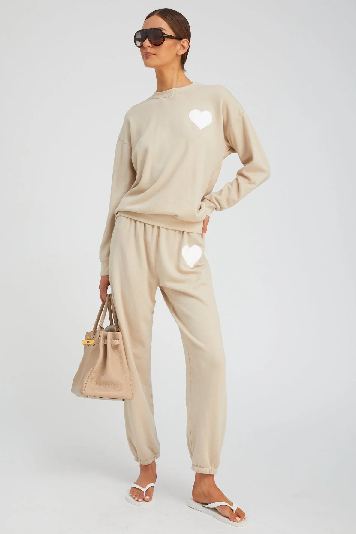 SPRWMN's heart logo joggers are made from our signature cotton-fleece blend, renowned for its luxuriously-soft, yet lightweight feel. Subtly printed with our iconic heart logo, these sweatpants are designed for a relaxed fit creating the perfect balance between casual and chic. Complete the look with our signature heart sweatshirt or hoodie. COLOR: Oat, White Heart FIT & MEASUREMENTS - Fits true to size - Kiana is 5'11 & wears size Small PRODUCT DETAILS - 50% Polyester, 38% Cotton, 12% Rayon - Elastic waistband, pull-on fit - For first wash, machine wash cold by itself - Machine wash cold, hang to dry
