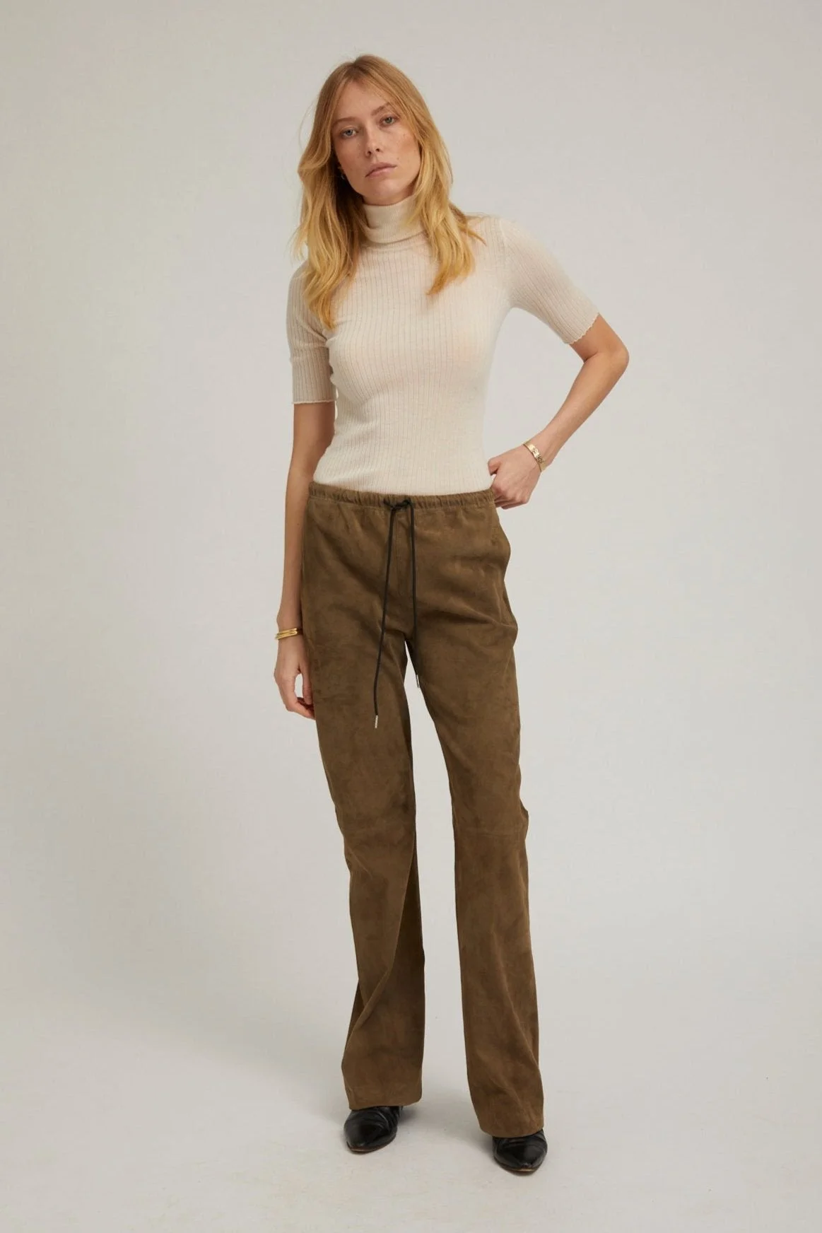 The leather drawstring pants, made in our signature stretchy French plonge suede leather, are buttery-soft and feature a breathability technology exclusive to SPRWMN, making them wearable from summer to winter. These pants have a straight leg silhouette to elongate the legs, and a relaxed fit that is meant for a comfortable, yet luxurious look. The adjustable drawstring allows for versatility so they adapt to your body and can be worn fitted to the waist, as desired. COLOR: Olive FIT & MEASUREMENTS - Runs large - Our lambskin gives naturally over time; if in-between sizes, size down - Relaxed fit - Lauren wears size Small PRODUCT DETAILS - 100% French Lambskin - Stretch Leather - Cotton-Lycra lining - Eco friendly, hypoallergenic and chrome-free vegetal dyed - Adjustable drawstring waistband, pull-on fit - 2 slit, side pockets - Leather specialist clean only