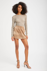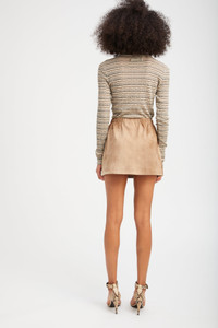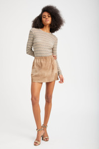 Our pull on skirt, made in our buttery soft signature plonge stretch-suede leather, this piece will feel like a second-skin due to its extreme breathability – a property exclusive to SPRWMN – making it wearable all year round. Designed for a slightly relaxed and feminine fit, wear this skirt casually with a cashmere tee-shirt and loafers, or dress it up with a button down and heels. COLOR: Sepia FIT & MEASUREMENTS - Fits true to size - 16.5" length, 24" sweep - Mika wears size Extra Small PRODUCT DETAILS - 100% French Lambskin - Stretch Leather, Cotton-Lycra lining - Elastic waistband, pull-on fit - Eco friendly, hypoallergenic and chrome-free vegetal dyed - Leather specialist clean only