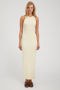 Made in our super soft ribbed fabric, this timeless knit is breathable and feels like second-skin on, while elevating your lounge look. Designed with maximum recovery and resilient stretch, this dress hugs your curves in all the right places for a naturally slimming fit that maintains its shape and comfort overtime. With a high neckline silhouette that falls at the mid-calf, this is a classic wardrobe staple you'll wear season after season. COLOR: Butter FIT & MEASUREMENTS - Fits true to size - Designed for a slightly snug fit - 52.5" length - Emma is 5'10 & wears size Small PRODUCT DETAILS - 98% Tencel, 2% Spandex - Small vertical ridges for a slimming effect - Machine wash cold, tumble dry low