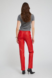 A luxurious take on a classic straight-leg pant that hits just at the ankle, made in our signature stretch-leather for an effortlessly chic and wearable look. Featuring five functional pockets, belt loops and an ultra-sleek fit, these pants strike the perfect balance of modern and edgy. With a wide range of styling options, these pair well with heeled boots or sneakers, a cashmere sweater or a leather top. COLOR: Red FIT & MEASUREMENTS - Fits true to size - Our lambskin gives naturally over time; if in-between sizes, size down - 34” inseam, 11” rise - Kennedy is 5'11" & wears size Small PRODUCT DETAILS - 100% French Lambskin - Stretch Leather - Cotton-Lycra lining - Eco friendly, hypoallergenic and chrome-free vegetal dyed - Button front, zipper fly - 5 functional pockets - Leather specialist clean only