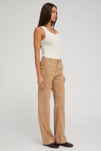 A luxurious take on your classic trouser, made in our buttery-soft, stretch- suede leather. Get ready for an effortlessly chic and easy to wear relaxed-fit that sits below the waist; featuring 2 functional pockets and a concealed zip for a sleek and timeless look. With a wide range of styling options, wear these casually with loafers and a cashmere sweater, or dressed up with heels and turtleneck. COLOR: Sand FIT & MEASUREMENTS - Fits true to size - Our lambskin gives naturally over time; if in-between sizes, size down - Relaxed fit - 33 3/4" inseam, 9 1/4" leg opening - Anna is 5'11 & wears size Small PRODUCT DETAILS - 100% French Lambskin - Stretch Leather - Cotton-Lycra lining - Eco friendly, hypoallergenic and chrome-free vegetal dyed - Zipper, hook and eye closure - Leather specialist clean only