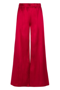 A chic wide leg pant made from smooth silk charmeuse with a slight sheen. Cut in a wide leg silhouette and fitted with elongating pintucks down the front, these pants are designed with a comfortable stretchy elastic waistband for easy, pull-on wear. A chic style for day or night, style these with the matching cropped silk cami or a classic button down shirt. COLOR:Scarlet FIT & MEASUREMENTS - Style runs small * - 32" inseam - Model wears sizeSmall PRODUCT DETAILS - 100% Silk Charmeuse - Elastic waistband, pull-on fit - Elongating pintucks down the front - 2 functional pockets - Dry clean only