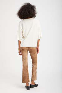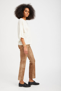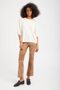 Our buttery-soft Ankle Flare Leggings feature a skin-tight fit with a subtle kick-flare at the ankle for a naturally elongating look. Made from our plonge stretch-suede leather, these pants feel like a second-skin due to their extreme breathability technology, which provides maximum mobility and comfort, while regulating your temperature all year round, so they'll be the first leather pants you can wear in the summer without overheating. Fit with our signature high-waisted Japanese elastic waistband, which provide a figure-sculpting fit that conform to your body-- another reason these pants will become your forever-favorite. COLOR: Sepia FIT & MEASUREMENTS - Fits true to size - Meant to fit tight at first-try - leather naturally gives; if in between sizes, size down - High-rise, skinny fit - 28" inseam, 8" leg opening, 3 3/8" waistband depth - Mika wears size Extra Small PRODUCT DETAILS - 100% French Lambskin - Stretch Leather - Cotton-Lycra lining - Elastic waistband, pull-on fit - Eco friendly, hypoallergenic and chrome-free vegetal dyed - Leather specialist clean only