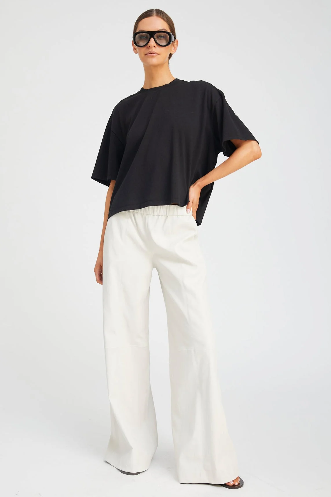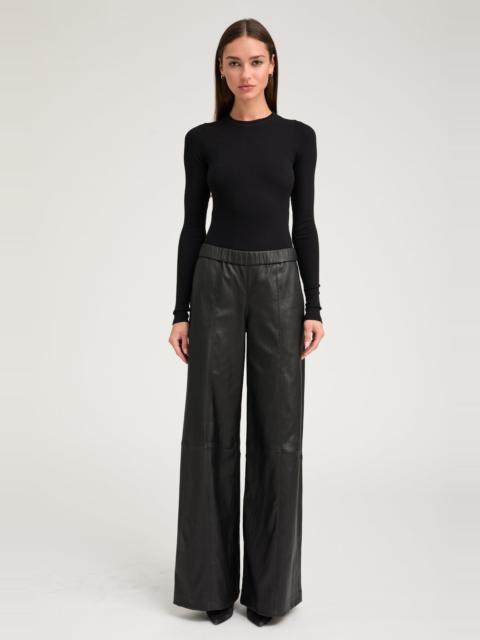 A high-rise wide leg pant, artfully designed with an ultra-flared hem that mimics a trouser but with an easy pull-on fit. Made in our stretchy plonge leather, these pants are buttery-soft to touch and extremely lightweight, while maintaining a structured and luxurious look. Designed with tailored pintucks down the front and back to elongate the legs with a cinched waist for a fitted and flattering look, these pants can be worn day to night. COLOR: Shell FIT & MEASUREMENTS - Fit true to size - 32" inseam, 14" leg opening - Our lambskin gives naturally over time; if in-between sizes, size down - Kiana is 5'11" & wears size Small PRODUCT DETAILS - 100% French Lambskin - Stretch Leather - Cotton-Lycra lining - Elastic waistband, pull-on fit - Eco friendly, hypoallergenic and chrome-free vegetal dyed - 2 functional pockets - Leather specialist clean only