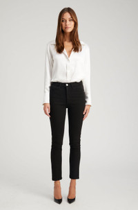 Our classic Skinny Straight Leg, made from stretch-denim that moves with you and won't lose its shape over time. Featuring our signature V-back belt loops and faux croc embossed label for a chic detail that accentuates your natural waist, these pants will quickly become your favorite everyday jeans. Designed with a high rise and a slim fit that hugs the waist and thighs, pair with a cashmere sweater or classic baby tee. WASH: Stevie - True Black FIT & MEASUREMENTS - Fits true to size - High rise, skinny leg - 29" inseam, 10.5" rise, 12" leg opening - Kiana is 5'11 & wears size 26 PRODUCT DETAILS - 98% Cotton, 2% Elastane - Stretch Denim - Italian Denim - Machine wash cold, tumble dry low - Front zipper & button closure