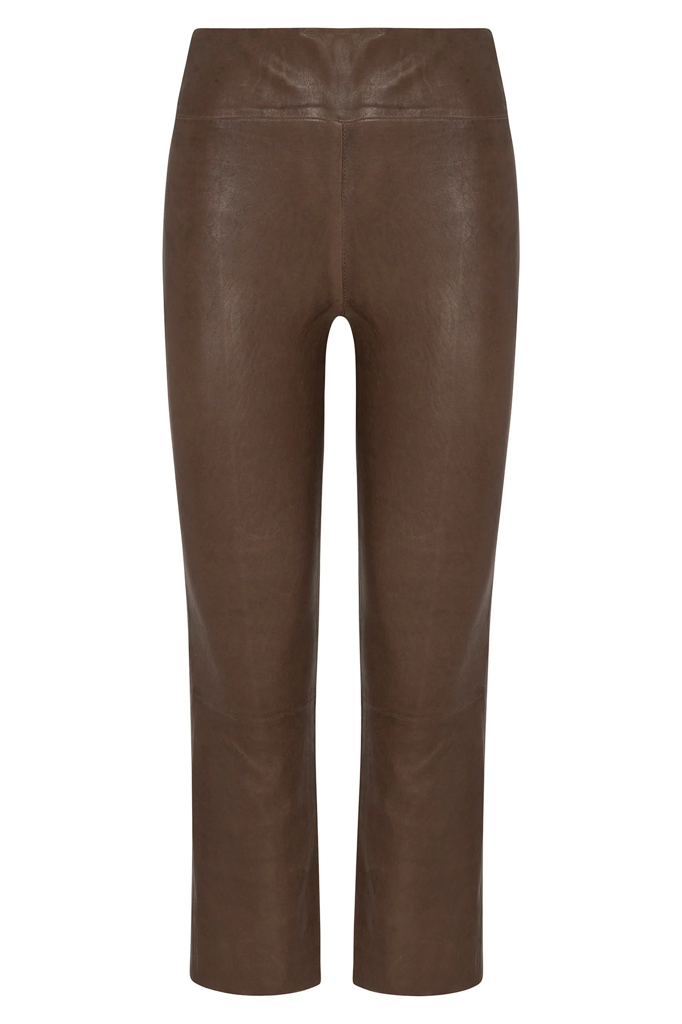 Our signature Crop Flare Leggings, are fitted with a high-rise elastic waistband and subtle kick-flare at the bottom for a figure-sculpting fit. Made in our signature stretchy French plonge leather, they feel like a second-skin due to their extreme breathability – a property exclusive to SPRWMN – making them wearable all year round, and guaranteed to become a wardrobe staple. Style them casually with sneakers and a simple tee, or dress them up with heels and a button down. COLOR: Truffle FIT & MEASUREMENTS - Fits true to size - Meant to fit tight at first-try – leather naturally gives; if in between sizes, size down - High-rise, slim fit - 25" inseam, 8" leg opening, 3 3/8" waistband depth PRODUCT DETAILS - 100% French Lambskin - Stretch Leather - Cotton-Lycra lining - Elastic waistband, pull-on fit - Eco friendly, hypoallergenic and chrome-free vegetal dyed - Leather specialist clean only