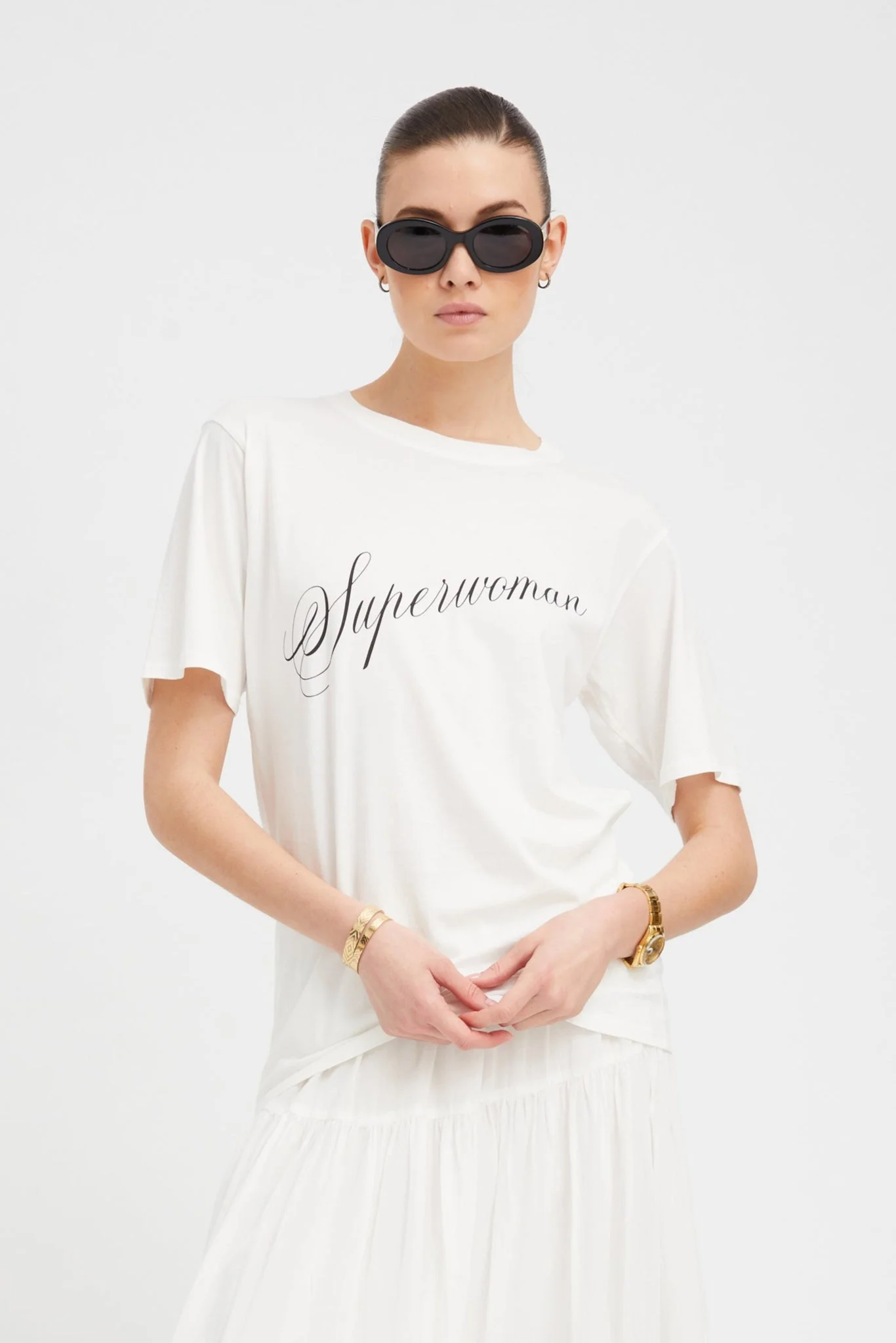 A comfy, slightly oversized crewneck t-shirt, elegantly printed with "superwoman." Wear this tee with your favorite SPRWMN jeans or sweatpants for a laid back, yet chic, look. COLOR: White, Black Logo FIT & MEASUREMENTS - Slightly oversized fit - Kennedy wears size Small PRODUCT DETAILS - 100% Cotton - Short sleeve - Machine wash cold, tumble dry low