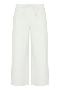Our take on an athletic track pant made entirely out of our buttery-soft leather. This cropped, wide-leg silhouette has a relaxed fit for a chic, sporty look. These pants are made in our signature French stretch-leather, so they feel like a second-skin and are extremely breathable for year-round wear. The adjustable drawstring allows for versatility and can be worn fitted to the waist, as desired. COLOR: White FIT & MEASUREMENTS - Fits true to size; Relaxed fit - 26" inseam, 11" rise - Our lambskin gives naturally over time; if in-between sizes, size down - Emma is 5'10 & wears size Small PRODUCT DETAILS - 100% French Lambskin - Stretch Leather - Cotton-Lycra lining - Eco friendly, hypoallergenic and chrome-free vegetal dyed - Adjustable drawstring waistband, pull-on fit - 2 slit, side pockets - Leather specialist clean only