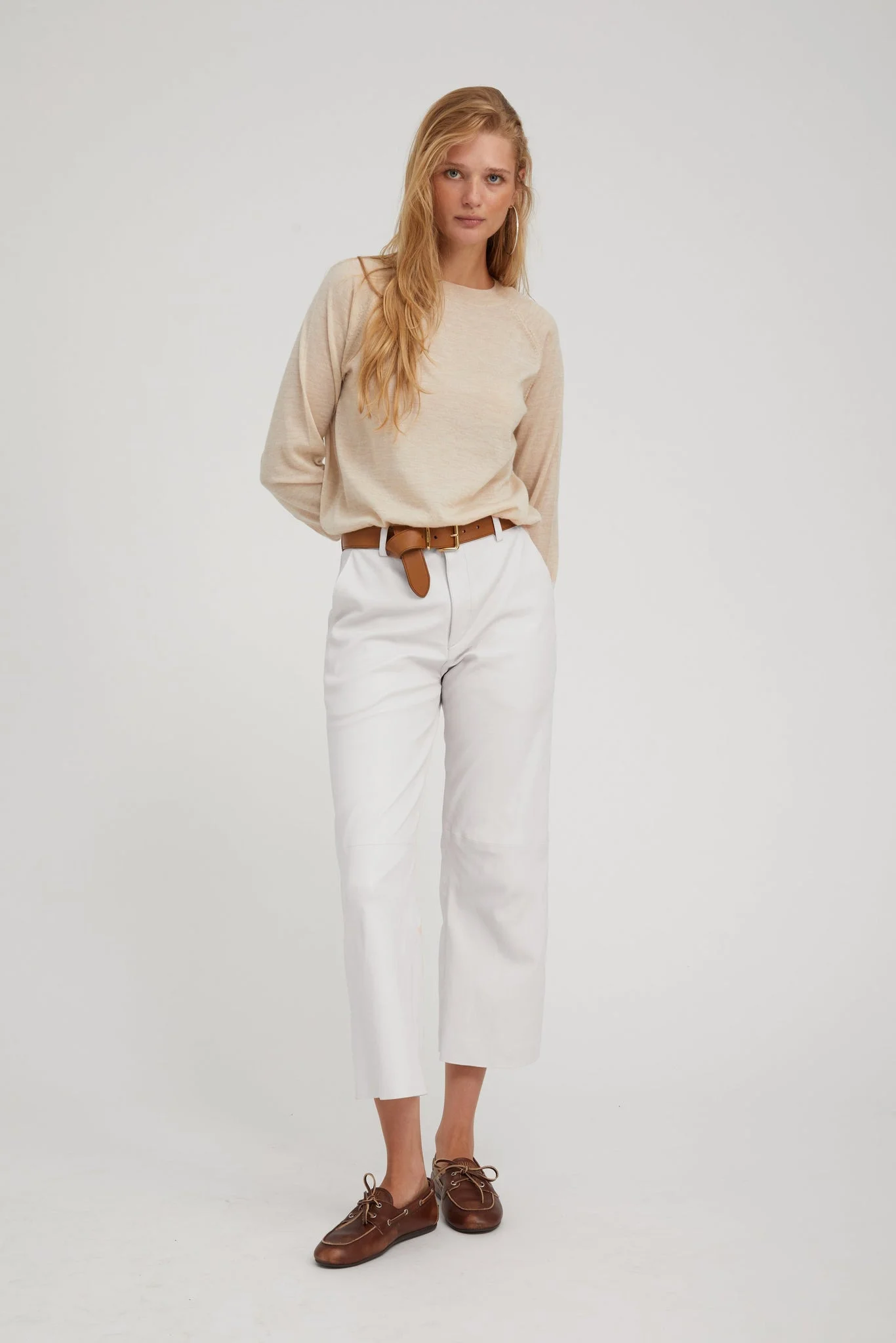 A luxurious cropped take on our classic trouser, made in our buttery-soft, stretch-leather. An effortlessly chic and easy to wear relaxed-fit that sits below the waist; featuring 2 functional pockets and a concealed zip for a sleek and timeless look. With a wide range of styling options, wear these casually with loafers and a cashmere sweater, or dressed up with heels and a turtleneck. COLOR: White FIT & MEASUREMENTS - Emma wears size Small - Fits true to size - Mid-rise - Our lambskin gives naturally over time; if in-between sizes, size down - 26.5" inseam, 10 3/4" rise, 9 1/4" leg opening PRODUCT DETAILS - 100% French Lambskin - Stretch Leather - Cotton-Lycra lining - Eco friendly, hypoallergenic and chrome-free vegetal dyed - Button front, zipper fly - 2 back welt pockets - Leather specialist clean only