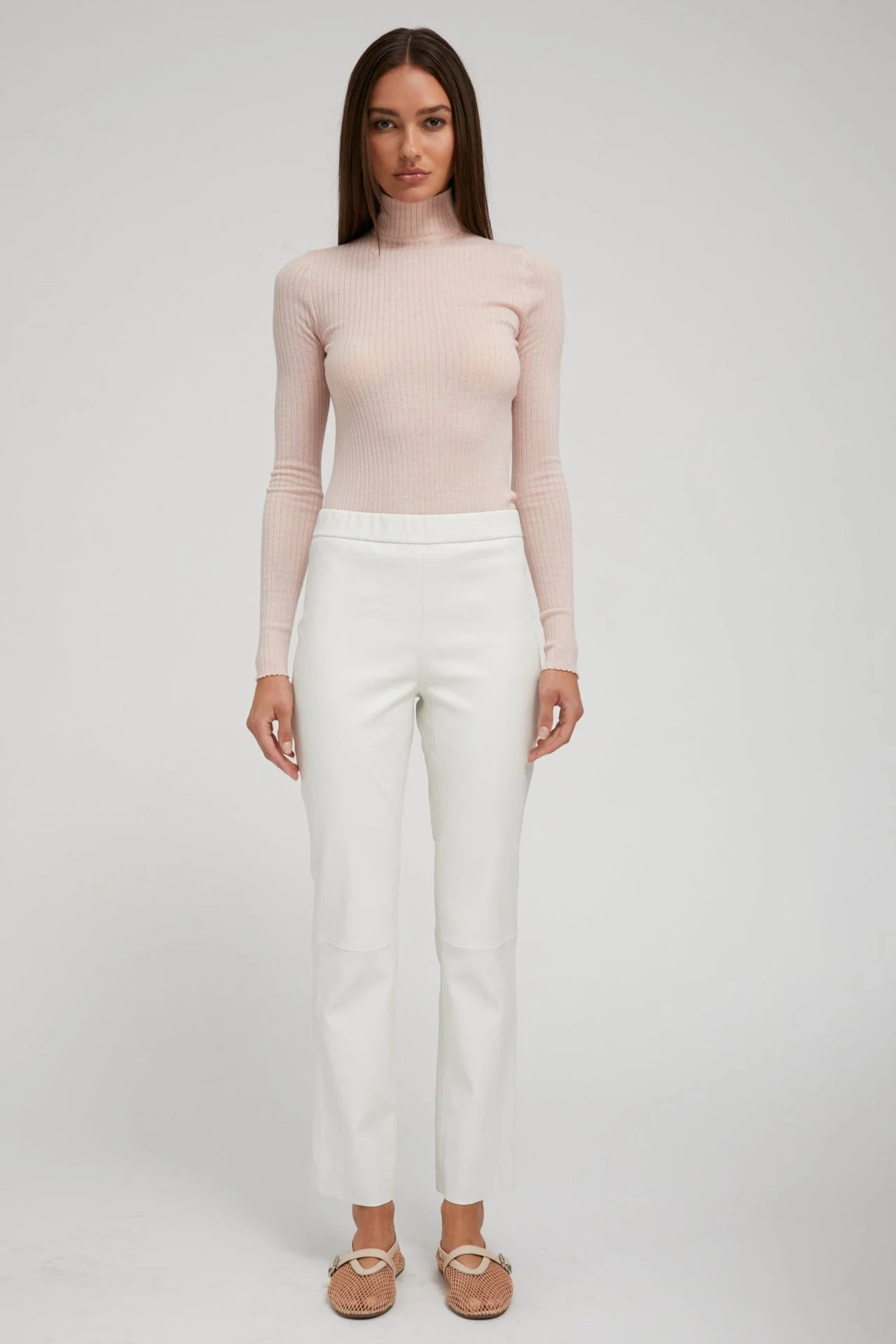 A classic cigarette silhouette pant, made in our signature stretch-leather, are effortlessly chic and easy to wear. Designed for a relaxed fit with a comfortable elastic-stretch waistband, these pants combine the look of a classic pant with the comfort and wearability of a legging. COLOR: White FIT & MEASUREMENTS - Fits true to size - Our lambskin gives naturally over time; if in-between sizes, size down - Anna is 5'11 & wears size Small PRODUCT DETAILS - 100% French Lambskin - Stretch Leather - Cotton-Lycra lining - Elastic waistband, pull-on fit - Eco friendly, hypoallergenic and chrome-free vegetal dyed - Leather specialist clean only