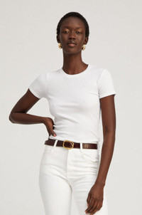 The perfect classic short sleeved crewneck t-shirt made in our breathable, ultra-stretchy, rib knit fabric that is wearable in any climate. Small horizontal ridges help to create a slimming and figure-hugging silhouette with a slightly tighter fit. Tuck it into your favorite jeans or wear it under thick leather layers. COLOR:White FIT & MEASUREMENTS - Fits true to size - Designed for a slightly snug fit - Adama is 5'11 & wears size Small PRODUCT DETAILS - 98% Tencel, 2% Spandex - Small vertical ridges for a slimming effect - Crewneck - Machine wash cold, tumble dry low