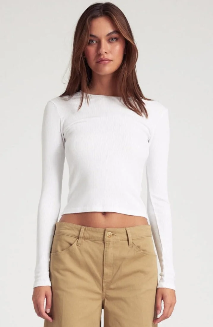 Every well-edited wardrobe requires a classic T-shirt and our Long Sleeve Baby Tee ticks all the right boxes. Made in our super soft ribbed fabric, this timeless knit is breathable and feels like second-skin on. This style has a crew neckline, long sleeves and is designed for a slightly snug fit. Pair it with your favorite jeans. COLOR: White FIT & MEASUREMENTS - Fits true to size - Designed for a slightly snug fit - Kiana is 5'11 & wears size Small PRODUCT DETAILS - 98% Tencel, 2% Spandex - Small vertical ridges for a slimming effect - Crew neck - Machine wash cold, tumble dry low