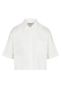 A tasteful take on classic workwear, this short sleeve button down is made from breathable cotton poplin, designed to feel soft while maintaining a crisp structure and feminine drape. Made to fall just below the natural waist, this silhouette perfectly aligns to meet your high waisted bottoms for a clean, chic look, without the hassel of a tuck. With endless styling options, this top pairs well with any trouser. COLOR: White FIT & MEASUREMENTS - Fits true to size - Adama is 5'11 & wears size Small PRODUCT DETAILS - 100% Cotton - Machine wash cold, tumble dry low
