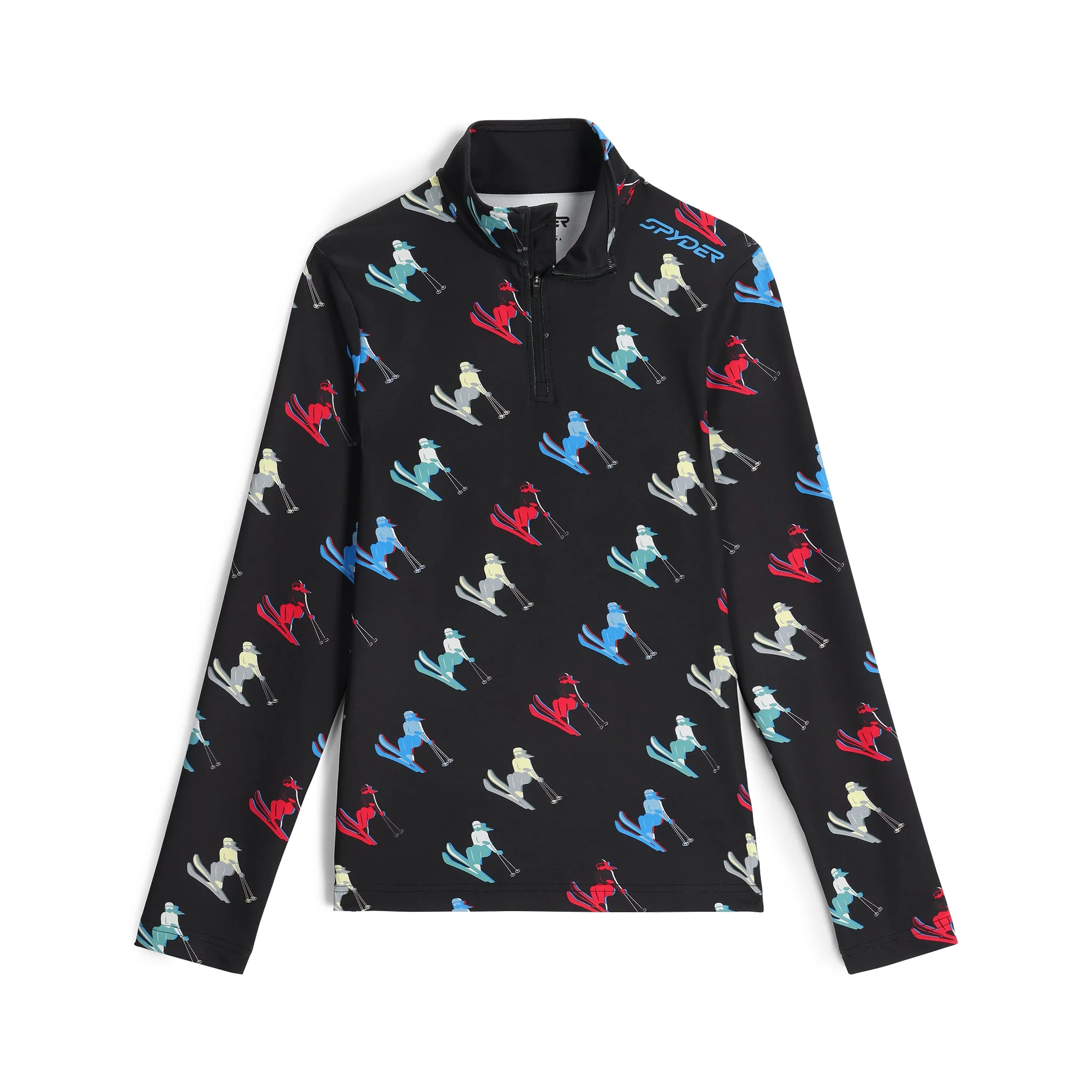 The custom Spyder prints on these ½ zip t-necks feature unique designs that will go with any outfit. This stretch polyester t-neck is an ideal moisture-wicking base layer while out on the mountain or as a light layer doing any active activity. - 87% Polyester 13% Elastane Stretch Knit Wicking & UPF 50+ - YKK® Reverse coil center front half zipper - Custom graphics - CB Length: Size M: 25" - Fit: Fitted - 87% POLYESTER / 13% ELASTANE - Product qualifies for limited lifetime warranty - 38B015400_BLK
