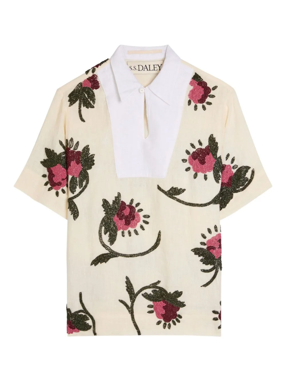 Iona beaded linen top Highlights - Natural - Floral pattern - Beaded embellishment - Keyhole neck - Short sleeves - Collared Imported Composition Linen/Flax 100% Washing instructions Read Manufacturer Guidelines
