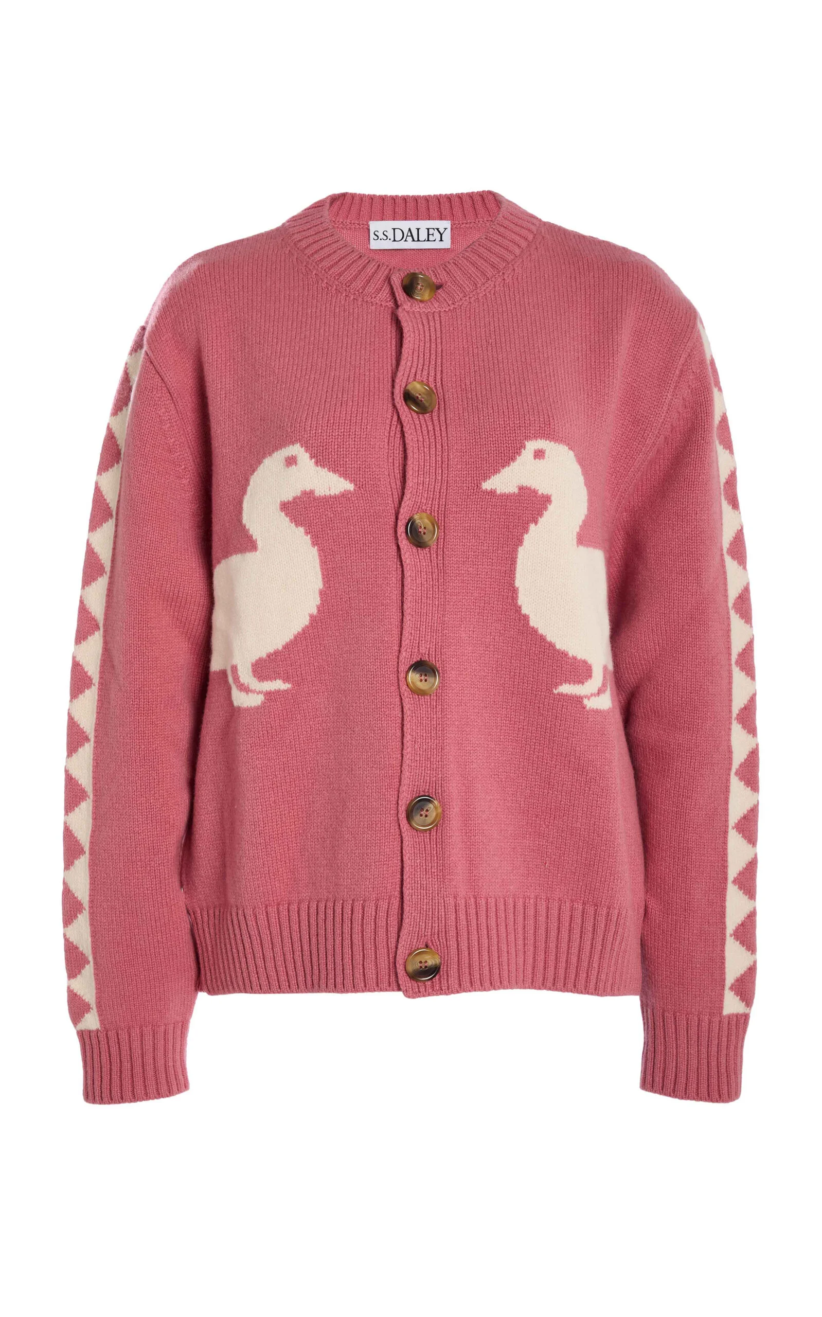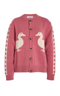 For Fall '25, the emerging talent (and a favorite of Harry Styles) evolves the heritage pieces that define British fashion into sleek yet playful standouts. The 'Jasper' Duck Cardigan is a signature piece of the brands inspired by a 1940s Oxford rowing team cardigan. This unique knit pays tribute to the historic "Mallard Song", sung by Oxford teams to boost spirit during rowing victories, and is beautifully reimagined with mirrored ducks crafted in dusty salmon pink and ecru tones. PRODUCT DETAILS - Fall '25 - Button fastening at front - Composition: 100% lambswool - Dry clean - Made in Portugal SIZE & FIT - Our model is wearing a size Small - Model is 5'9" with a 32" bust, 24" waist, and 35" hip