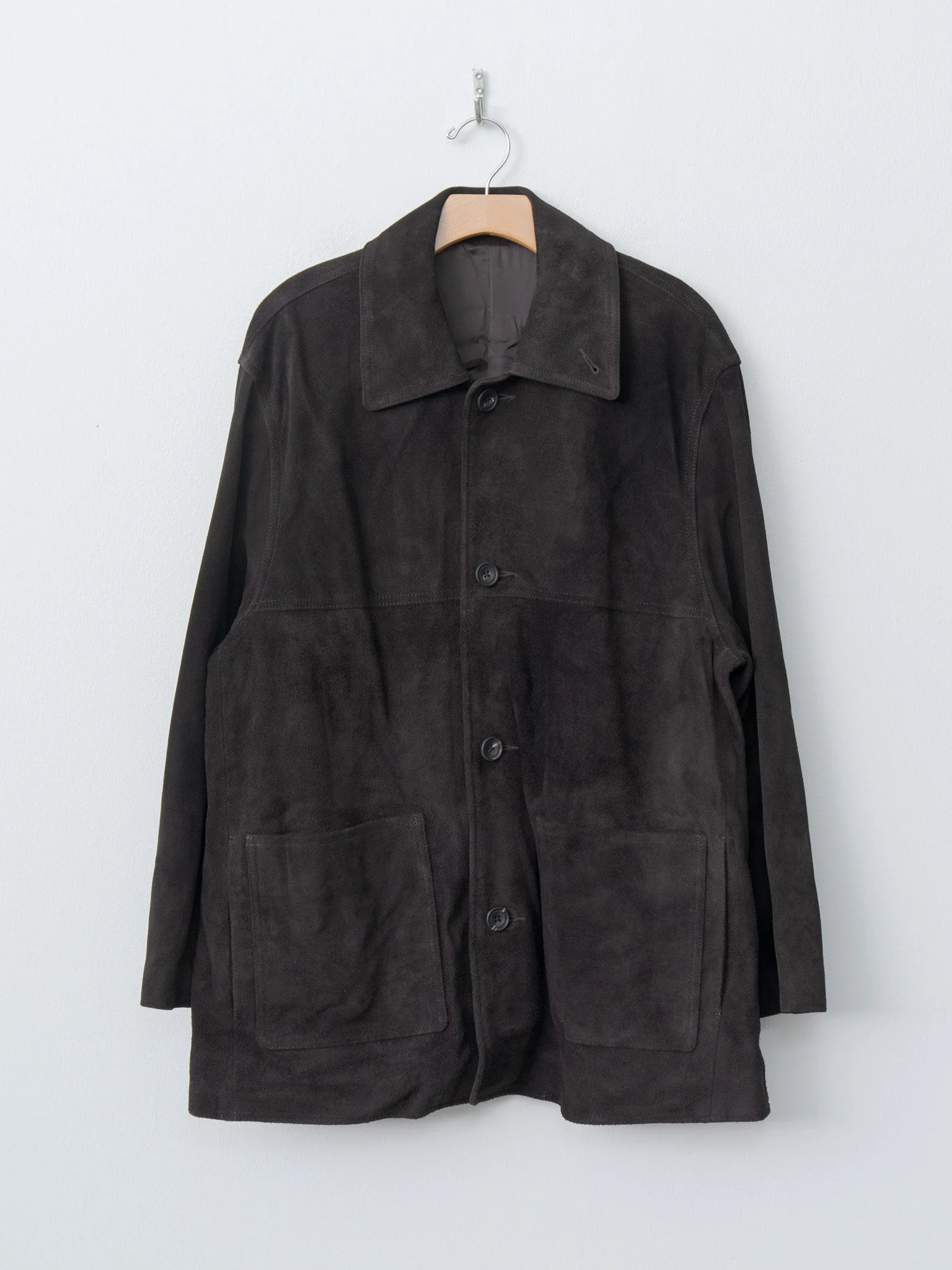 Ssstein's take on the car jacket crafted from soft cow suede pared down to 0.8mm, with a softly finished interior that enhances flexibility. It features a a clean, modern cut with minimal details and balanced construction. Details include full lining, buttoned front, dropped shoulders, patch pockets, side seam pockets and a back vent. - Made in Japan - 100% Cow Leather - Available in Dark Brown - The model is 5'8"/173cm and wears size XS - Unisex sizing - we recommend XS for XS/S, S for M/L