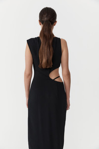 A minimal black midi dress with a difference. The Arc Cut Out Dress has been crafted with an asymmetric boat neckline, midi length, side split and contoured fit. Boasting a side cut-out with a lingerie strap detail, the Arc Cut Out Dress engages in the art of obvious revelation while maintaining a timeless and refined feel. Pair with your favourite St. Agni kitten heel for a subtly flirtatious evening ensemble. DETAILS Materials - 97% Viscose / 3% Spandex body - 100% Lyocell lining - Forest Stewardship Council (FSC) Viscose Certification Garment Details - Midi length, boat neck, cutout with lingerie strap detail, side split Manufacturing - Manufacturer has signed the St. Agni Code of Conduct - Fairwear audited - OEKO-TEX 100 certification - Responsibly made in China CARE - Dry clean only - Wash with similar colours - Do not bleach or tumble dry - Cool iron