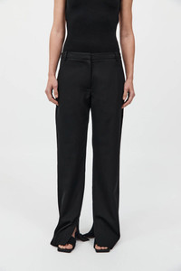 The 90s Split Leg Pants offer a sleek, understated silhouette. Designed with a low-waisted fit and straight-leg cut, the 90s Split Leg Pants fall effortlessly for a relaxed yet polished look. Pair with a simple basic or a matching blazer for refined yet elevated daily dressing. DETAILS Materials - 51% Viscose / 49% Virgin Wool - Lining: 100% Lyocell Garment Details - Low-waisted, front fly closure, belt loops, front slash pockets, straight leg, ankle split detail - Slim fit Manufacturing - SMETA Sedex Ethical Audit - OEKO-TEX Standard 100 Certification - Made responsibly in China CARE - Dry cleaning recommended - Iron on low heat