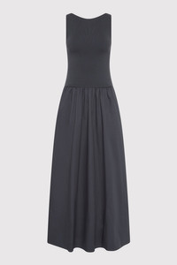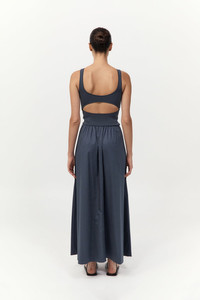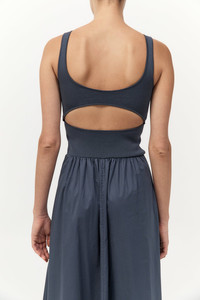 The Bateau Cut Out Dress offers a refined silhouette with subtle cut-out detailing. Featuring a fitted knit bodice that flows into a relaxed poplin skirt and maxi length. A versatile wardrobe essential, the Bateau Cut Out Dress transitions effortlessly from day to evening. DETAILS Materials - Bodice: 53% Viscose / 47% Recycled Polyester - Skirt: 100% BCI Cotton - SMETA Yarn - Recycled Polyester (GRS) Certificate - BCI Cotton Certificate Garment Details - Maxi length, bateau neckline, sleeveless, knitted bodice, front slash pockets, poplin skirt, unlined Manufacturing - SMETA Sedex Ethical Audit - OEKO-TEXT 100 Certification - Manufacturer has signed the St. Agni Code of Conduct - Responsibly made in China CARE - Cool hand wash - Wash with similar colours - Do not bleach - Do not tumble dry - Cool iron under cloth - Dry cleanable (P)