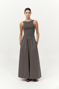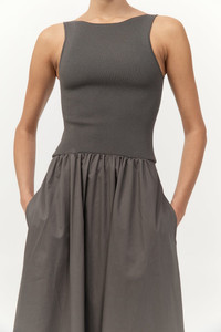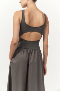 The Bateau Cut Out Dress offers a refined silhouette with subtle cut-out detailing. Featuring a fitted knit bodice that flows into a relaxed poplin skirt and maxi length. A versatile wardrobe essential, the Bateau Cut Out Dress transitions effortlessly from day to evening. DETAILS Materials - Bodice: 53% Viscose / 47% Recycled Polyester - Skirt: 100% BCI Cotton - SMETA Yarn - Recycled Polyester (GRS) Certificate - BCI Cotton Certificate Garment Details - Maxi length, bateau neckline, sleeveless, knitted bodice, front slash pockets, poplin skirt, unlined Manufacturing - SMETA Sedex Ethical Audit - OEKO-TEXT 100 Certification - Manufacturer has signed the St. Agni Code of Conduct - Responsibly made in China CARE - Cool hand wash - Wash with similar colours - Do not bleach - Do not tumble dry - Cool iron under cloth - Dry cleanable (P)