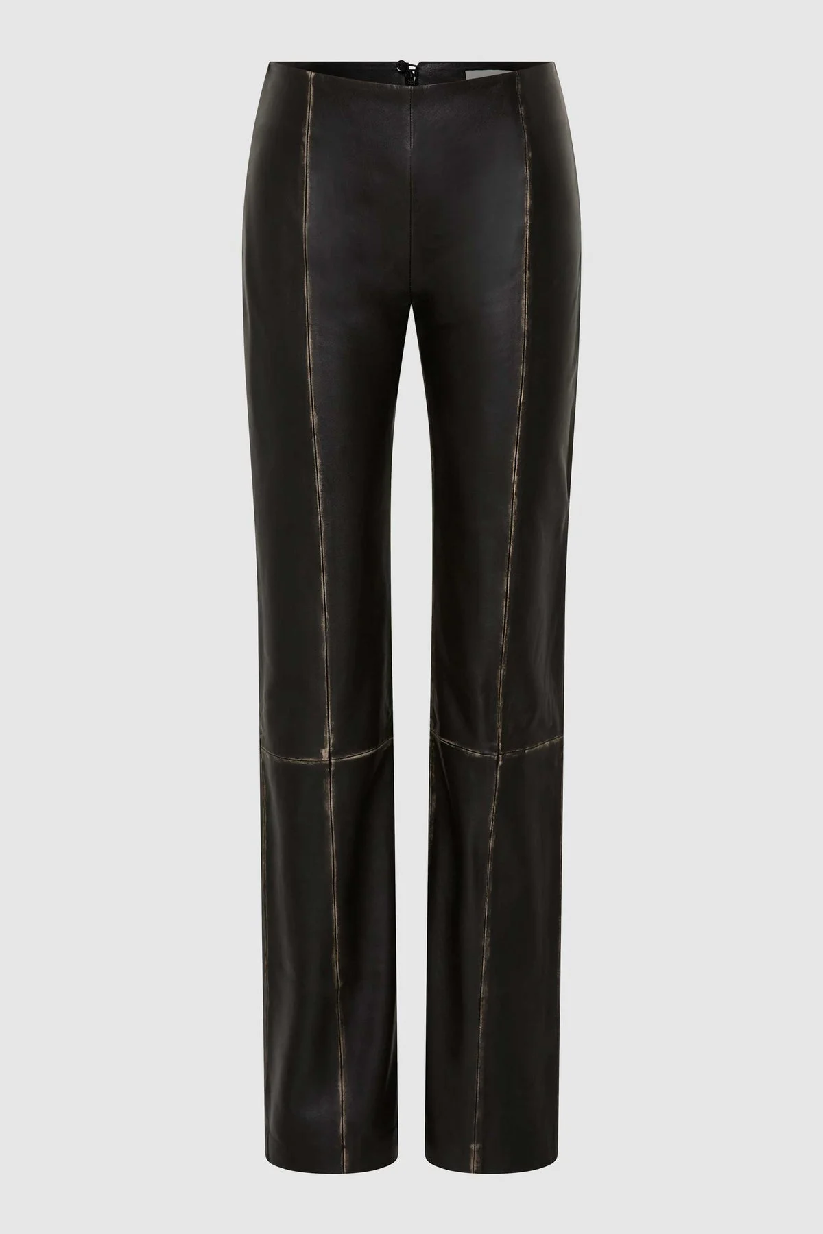 The Brushed Leather Pants feature a low-rise silhouette and a straight-leg cut for a relaxed yet refined fit. Crafted from buttery soft lamb leather with subtle brushed effect and lined in breathable 100% TENCEL™ Lyocell for all-day comfort. Understated and elevated, the Brushed Leather Pants bring a modern edge to everyday dressing. DETAILS Materials - 100% Lambskin Leather - Lining: 100% TENCEL™ Lyocell - Leather Working Group (LWG) Certified Garment Details - Low-rise, straight-slim leg, front and back panel detail, center-back invisible zip with button and loop, back darts, lined - Slim fit Manufacturing - SGS Social Accountability 8000 Audit Certification - Manufacturer has signed the St. Agni Code of Conduct - Responsibly made in India CARE - Dry clean only - Spot clean with damp cloth