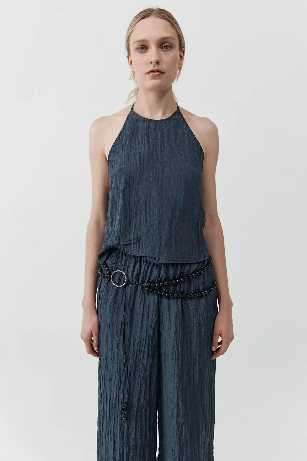 The Crinkle Halter Top features a halter neckline with self-tie fastening and an open back secured with an additional tie for a customizable fit. Crafted from 100% recycled polyester, it’s unlined for an effortless drape and lightweight feel. Pair with the Crinkle Relaxed Pants for a cohesive, laid-back ensemble with elevated ease. DETAILS Materials - 100% Recycled Polyester Garment Details - Halter neckline with self-tie fastening, sleeveless, back self-tie fastening, unlined Manufacturing - SMETA Sedex Ethical Audit - BSCI Social Audit - OEKO-TEX 100 Certification - Manufacturer has signed the St. Agni Code of Conduct - Responsibly made in China CARE - Cool gentle hand wash - Do not Soak - Do not bleach - Do not tumble dry - Dry In shade - Cool iron when required - Dry cleanable (P) - Clip back threads at raw edge after wash