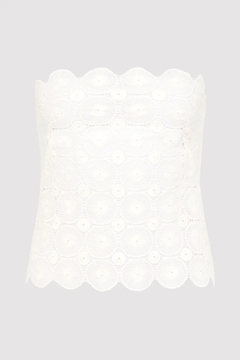 The Doily Top in 100% organic cotton has been cut to a strapless silhouette, featuring doily crochet detailing and scalloped edging. The Doily Top combines elements of vintage and modern, making it a statement addition to the minimalist wardrobe. DETAILS Materials - 100% Organic Cotton - Binding: 100% Cotton - Global Organic Textile Standard (GOTS) Certificate Garment Details - Strapless, doily crochet, scalloped edge, centre back invisible zip - Fitted Manufacturing - Manufacturer has signed the St. Agni Code of Conduct - SGS Social Accountability - Made responsibly in China CARE - Dry clean