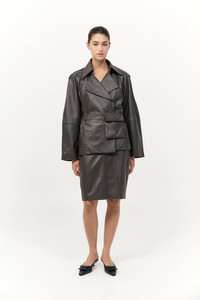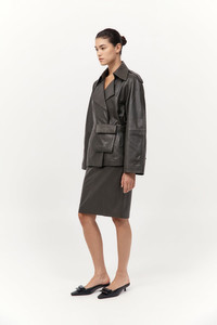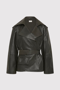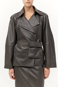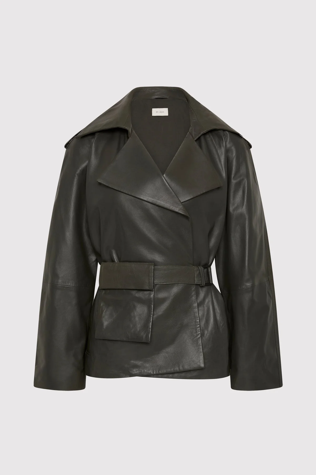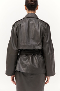 A refined silhouette that balances precision tailoring with everyday functionality, the Cropped Leather Trench has been crafted from 100% lambskin leather and lined in 100% TENCEL™ Lyocell. The Cropped Leather Trench features a double-breasted front, structured epaulettes and raglan sleeves with panel detailing. Completed with a belted waist with an integrated pocket. DETAILS Materials - 100% Lambskin Leather - Lining: 100% TENCEL™ Lyocell - Leather Working Group (LWG) Certified Garment Details - Cropped length, double breasted, epaulettes, front press studs, raglan sleeves with panel detail, belted waist with pocket, belt loops, back storm flap, lined Manufacturing - SGS Social Accountability - 8000 Audit Certification - Manufacturer has signed the St. Agni Code of Conduct - Responsibly made in India CARE Natural Leather Protector is recommended before wear. Use a good quality leather conditioner or protective spray to treat the product to increase its durability. Regularly clean leather with a soft brush or cloth, regularly air out leather, and where possible do not get leather wet. Blot away water or moisture as soon as possible, do not immerse leather in water to clean, do not dry wet leather with artificial heat like a radiator or hairdryer, do not machine wash leather, do not tumble dry leather, do not iron leather. Keep out of direct sunlight to avoid fading and avoid wet weather. Marks and variations in the leather are not considered a fault but are inherent to the natural beauty and uniqueness of the leather. When not in use we advise to store your St. Agni product in its protective bag and we recommend to continually treat it with a leather conditioner to keep it hydrated for a long life.