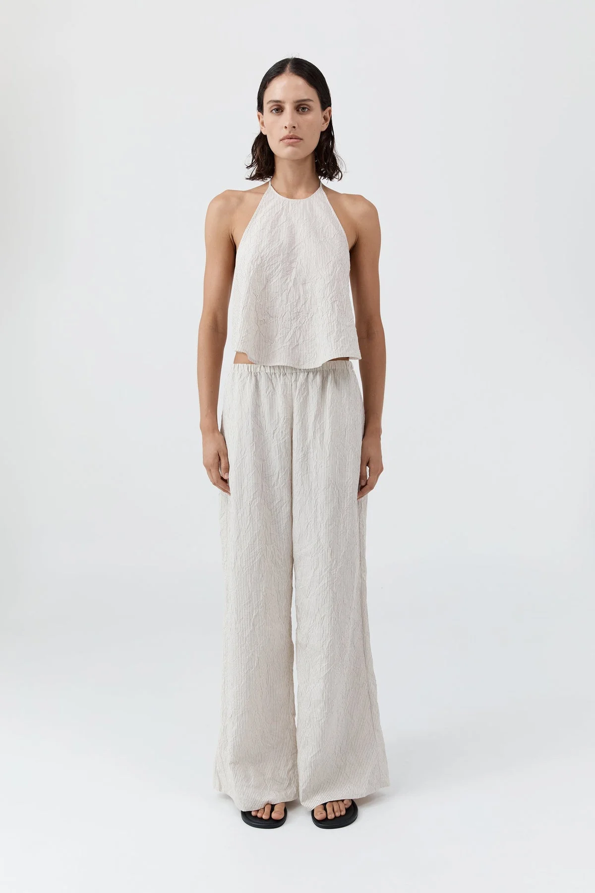 The Crushed Halter Top is defined by its minimalist silhouette and Japanese-inspired simplicity. Featuring a halter neckline with self-tie fastening, with an additional tie at the back waist. Pair with the Relaxed Crushed Pant for an effortlessly coordinated look. DETAILS Materials - 87% Viscose / 13% Polyamide Garment Details - Halter neckline with self-tie fastening, sleeveless, back self-tie fastening, unlined - Slim fit Manufacturing - SMETA Sedex Ethical Audit - Manufacturer has signed the St. Agni Code of Conduct - Responsibly made in China CARE - Dry clean only - Do not iron - Do not steam - Do not bleach - Do not tumble dry