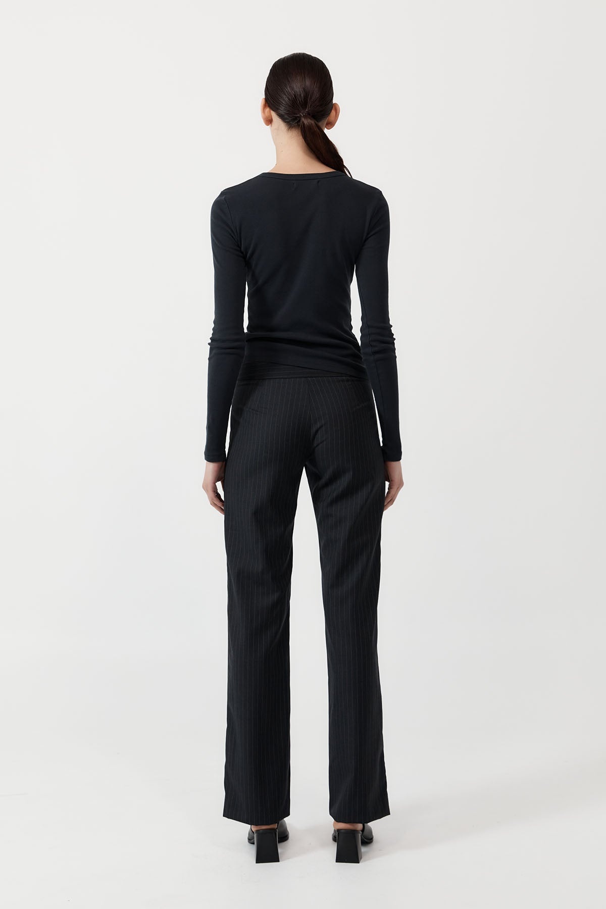 Inspired by classic tailoring, the Deconstructed Pinstripe Trousers are crafted with a low-slung waist, straight leg, slim fit and a contrast raw edge detail. Crafted from our signature responsibly sourced wool blend in a black pinstripe and made to be worn both formally and informally, the Deconstructed Pinstripe Trousers translate seamlessly from day to night styling. DETAILS Materials - 70% RWS Wool, 30% Recycled Polyester - RWS Wool Certificate & Recycled Polyester (GRS) Certificate Garment Details - Low waisted, straight leg, contrast raw edge detail, slim fit Manufacturing - Manufacturer has signed the St. Agni Code of Conduct - BSCI Social Audit - Oeko-tex 100 certification - Responsibly made in China CARE - Dry clean only - Do not bleach or tumble dry - Iron on low temperature