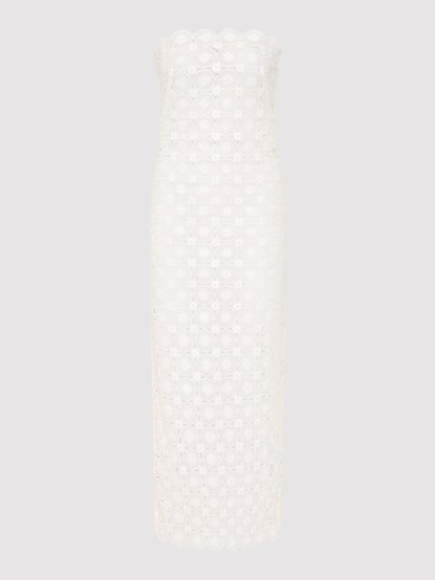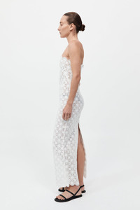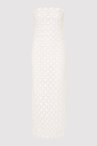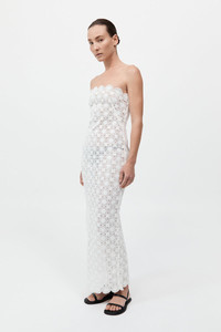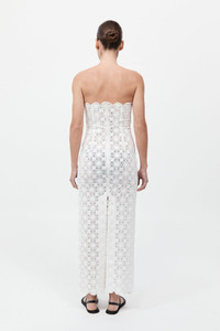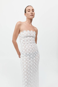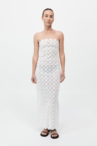 The Doily Column Dress in 100% organic cotton has been cut to a strapless, midi-length silhouette. Featuring doily crochet detailing and scalloped edging, the Doily Column Dress is completed with a back vent for ease of movement. DETAILS Materials - 100% Organic Cotton - Binding: 100% Cotton - Global Organic Textile Standard (GOTS) Certificate Garment Details - Strapless, doily crochet, scalloped edge, column silhouette, centre back invisible zip, back vent, midi length - Fitted Manufacturing - Manufacturer has signed the St. Agni Code of Conduct - SGS Social Accountability - Made responsibly in China CARE - Dry clean
