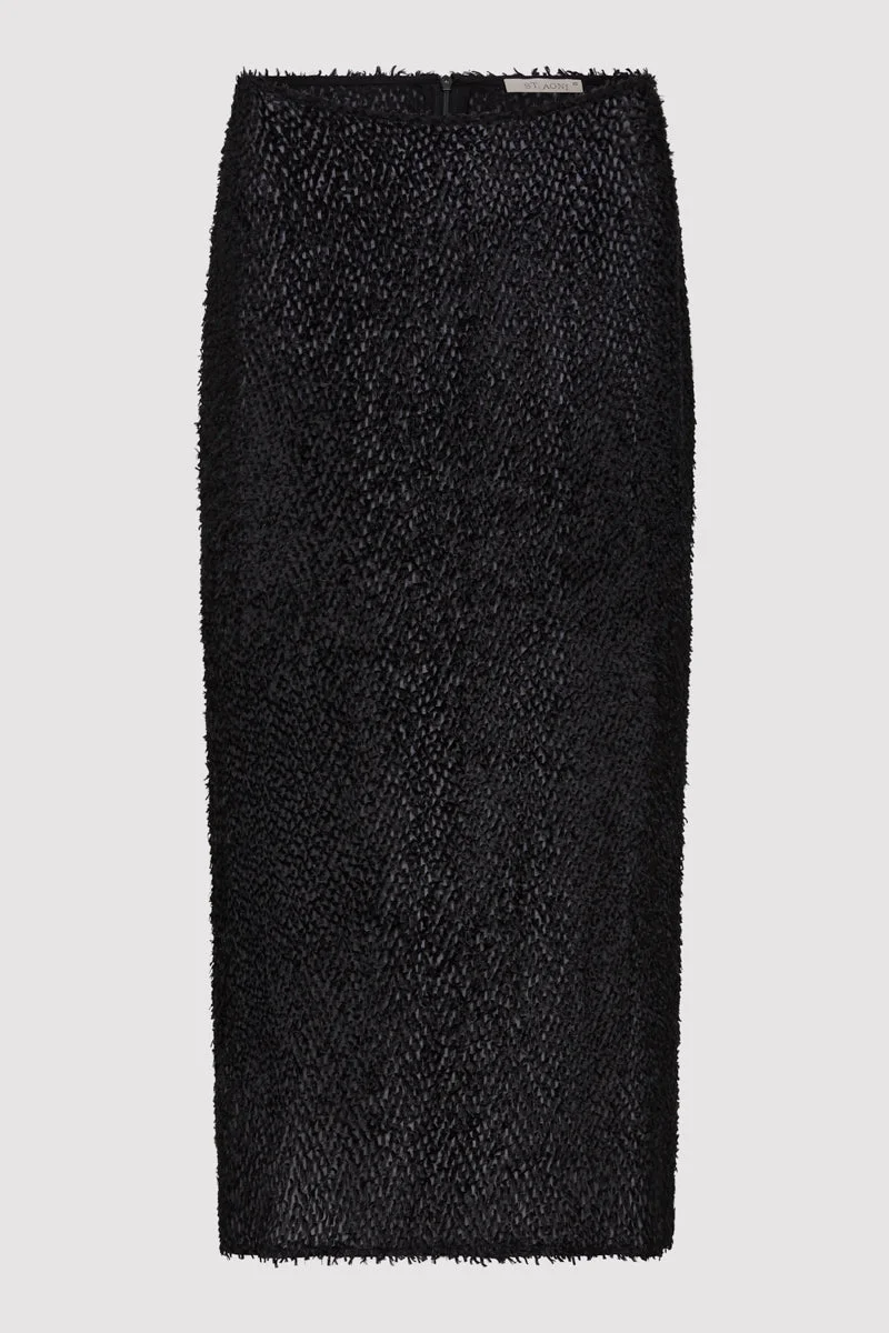 The Feathered Silk Skirt combines contemporary design with luxurious texture, adding subtle depth and dimension. With a low-waisted, column silhouette, the Feathered Silk Skirt creates a sleek, flattering shape. Pair with the Feathered Silk Tee for a coordinated, seamless ensemble that exudes effortless elegance. DETAILS Materials - 56% Viscose / 44% Silk Jacquard Garment Details - Low-waisted, column silhouette, feather jacquard texture, 7/8 length, centre back invisible zip - Slim fit Manufacturing - Manufacturer has signed the St. Agni Code of Conduct - BSCI Social Audit - Responsibly made in China CARE - Dry clean - Cold handwash - Drop to dry in shape - Do not tumble dry - Do not bleach - Warm iron on reverse side
