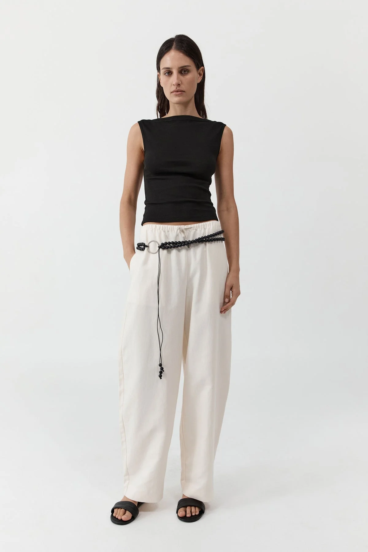 The Fine Drawstring Relaxed Pants balance function with ease. Cut with a relaxed wide leg and thin elasticated waistband, the Fine Drawstring Relaxed Pants are crafted from an organic cotton and linen blend, offering a gentle, breathable feel against the skin. An understated essential designed for pared-back, everyday dressing. DETAILS Materials - 77% Organic Cotton / 23% Linen - Organic Content Standard (OCS) Certificate - European Flax Garment Details - Mid rise, straight leg, elasticated waistband with drawcord, side seam pockets, back welt pockets, unlined - Relaxed fit Manufacturing - SMETA Sedex Ethical Audit - OEKO-TEX Standard 100 Certification - Manufacturer has signed the St. Agni Code of Conduct - Responsibly made in China CARE - Dry clean only - Do not bleach - Do not tumble dry - Iron on warm heat under cloth