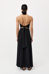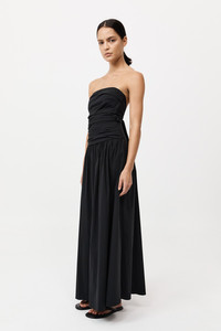 The Gathered Strapless Tie Back Dress falls to a maxi-length silhouette with an A-line skirt, offering a refined, yet effortless look. Side boning at the torso provides structure, while delicate gathering details add a soft touch. The back is complemented by a striking tie detail. The Gathered Strapless Tie Back Dress is destined for high rotation wear. DETAILS Materials - 61% Cotton / 31% Recycled Nylon / 3% Spandex - GRS (Recycled Nylon) Garment Details - Strapless tie back, side boning, gathering detail, centre back invisible zip, maxi length Manufacturing - Manufacturer has signed the St. Agni Code of Conduct - SGS Social Audit - Responsibly made in China CARE - Cool hand wash - Wash with similar colours - Do not bleach - Do not tumble dry - Cool iron under Cloth - Dry Cleanable P