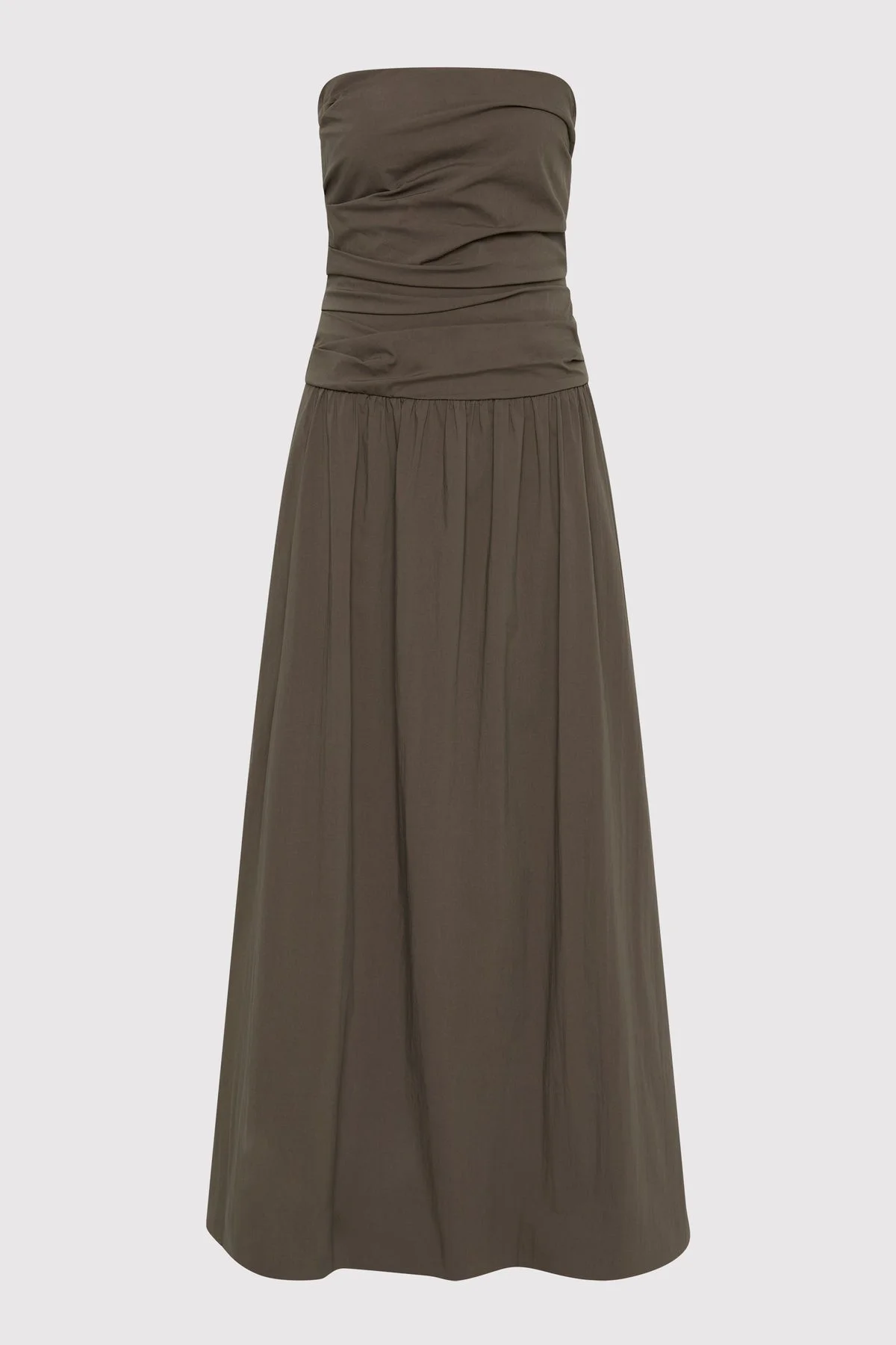 The Gathered Strapless Tie Back Dress falls to a maxi-length silhouette with an A-line skirt, offering a refined, yet effortless look. Side boning at the torso provides structure, while delicate gathering details add a soft touch. The back is complemented by a striking tie detail. The Gathered Strapless Tie Back Dress is destined for high rotation wear. DETAILS Materials - 66% Cotton - 31% Recycled Nylon - 3% Spandex Garment Details - Maxi length, strapless tie back, gathered bodice, side seam pockets, boning, center-back invisible zip, full circle skirt, unlined Manufacturing - SGS Social Audit - Manufacturer has signed the St. Agni Code of Conduct - Responsibly made in China CARE - Cool hand wash - Wash with similar colours - Do not bleach - Do not tumble dry - Cool iron under cloth - Dry cleaning recommended