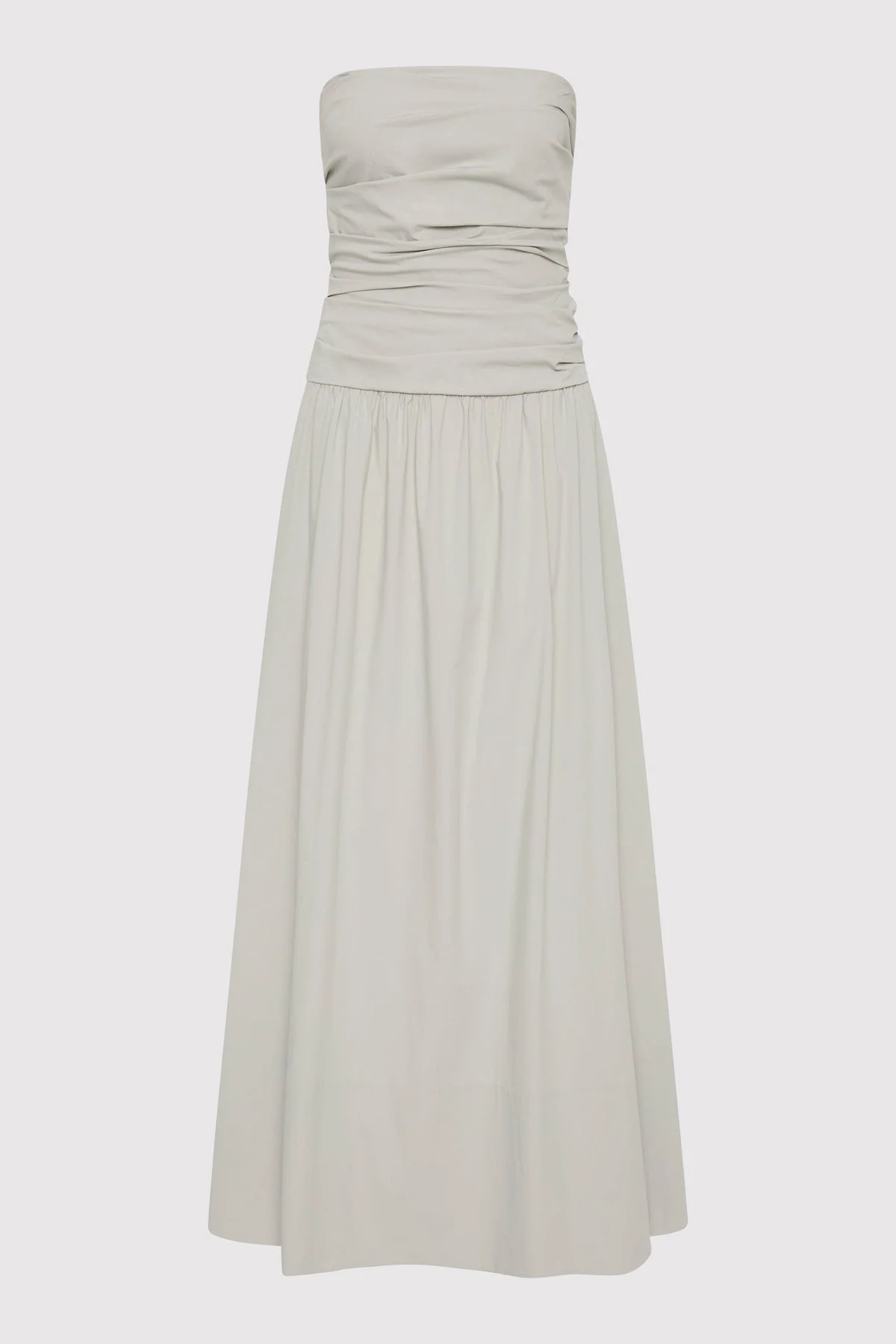 The Gathered Strapless Tie Back Dress falls to a maxi-length silhouette with an A-line skirt, offering a refined, yet effortless look. Side boning at the torso provides structure, while delicate gathering details add a soft touch. The back is complemented by a striking tie detail. The Gathered Strapless Tie Back Dress is destined for high rotation wear. DETAILS Materials - 66% Cotton - 31% Recycled Nylon - 3% Spandex Garment Details - Maxi length, strapless tie back, gathered bodice, side seam pockets, boning, center-back invisible zip, full circle skirt, unlined Manufacturing - SGS Social Audit - Manufacturer has signed the St. Agni Code of Conduct - Responsibly made in China CARE - Cool hand wash - Wash with similar colours - Do not bleach - Do not tumble dry - Cool iron under cloth - Dry cleaning recommended