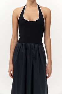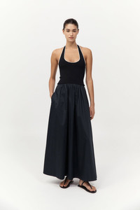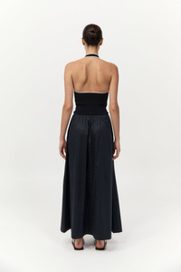 The Halter Gathered Dress offers a fluid silhouette, crafted with a fitted knit upper that flows into a gathered poplin skirt, falling to a maxi length. Featuring a scoop halter neckline, the Halter Gathered Dress is a versatile wardrobe staple that moves seamlessly from day to evening. DETAILS Materials - Bodice: 53% Viscose / 47% Recycled Polyester - Skirt: 100% BCI Cotton - Recycled Polyester (GRS) Certificate - SMETA Yarn - BCI Cotton Certificate Garment Details - Maxi length, scoop halter-neckline, sleeveless, knitted bodice, front slash pockets, gathered waist, poplin skirt, unlined Manufacturing - SMETA Sedex Ethical Audit - OEKO-TEXT 100 Certification - Manufacturer has signed the St. Agni Code of Conduct - Responsibly made in China CARE - Cool hand wash - Wash with similar colours - Do not bleach - Do not tumble dry - Cool iron under cloth - Dry cleanable (P)