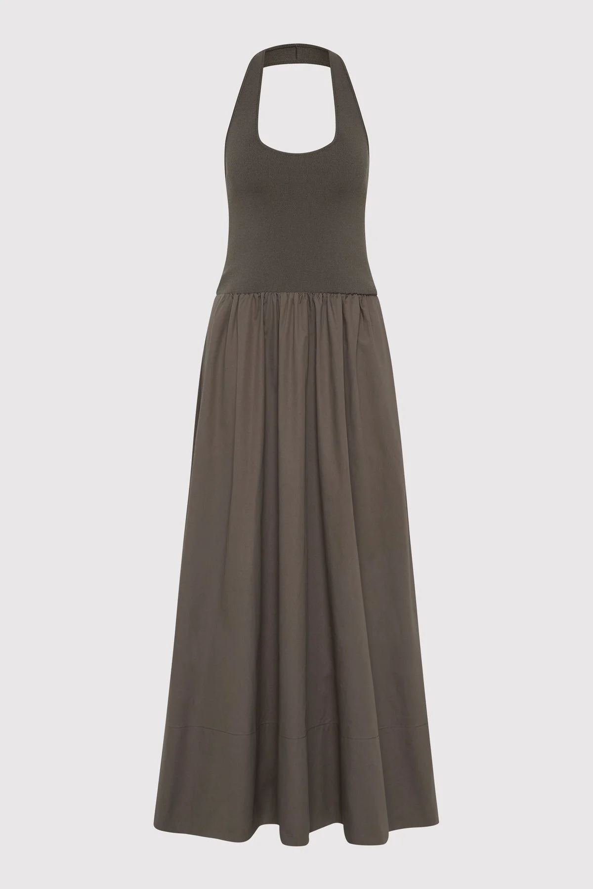 The Halter Gathered Dress offers a fluid silhouette, crafted with a fitted knit upper that flows into a gathered poplin skirt, falling to a maxi length. Featuring a scoop halter neckline, the Halter Gathered Dress is a versatile wardrobe staple that moves seamlessly from day to evening. DETAILS Materials - Bodice: 53% Viscose / 47% Recycled Polyester - Skirt: 100% BCI Cotton - SMETA Yarn - Recycled Polyester (GRS) Certificate - BCI Cotton Certificate Garment Details - Maxi length, scoop halter-neckline, sleeveless, knitted bodice, front slash pockets, gathered waist, poplin skirt, unlined Manufacturing - SMETA Sedex Ethical Audit - OEKO-TEXT 100 Certification - Manufacturer has signed the St. Agni Code of Conduct - Responsibly made in China CARE - Cool hand wash - Wash with similar colors - Do not bleach - Do not tumble dry - Cool iron under cloth - Dry cleanable (P)