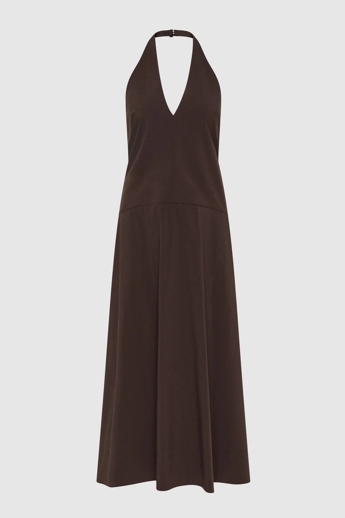 The Halter Plunge Dress offers fluid elegance with its 7/8 length and flattering halter V-neckline. Featuring bust darts for a tailored fit and curved hip detailing that enhances its refined silhouette. A full circle skirt adds movement, while the cotton blend fabrication ensures a light, airy feel, making the Halter Plunge Dress a versatile style for both casual and occasional dressing. DETAILS Materials - 66% Cotton / 31% Recycled Nylon / 3% Elastane - Recycled Nylon (GRS) Certificate Garment Details - 7/8 length, halter v-neckline, sleeveless, bust darts, center-back invisible zip, side pockets, curved hip detail, full circle skirt, unlined - Relaxed fit Manufacturing - SGS Social Accountability - Manufacturer has signed the St. Agni Code of Conduct - Responsibly made in China CARE - Cool hand wash - Wash with similar colours - Do not bleach - Do not tumble dry - Iron on low temperature under cloth - Dry clean (P)