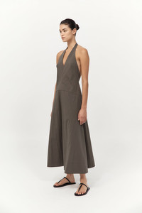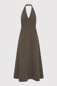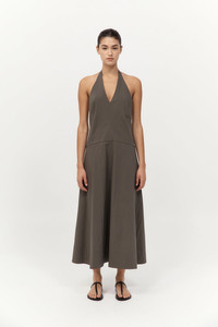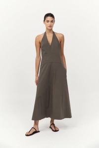 The Halter Plunge Dress offers fluid elegance with its 7/8 length and flattering halter V-neckline. Featuring bust darts for a tailored fit and curved hip detailing that enhances its refined silhouette. A full circle skirt adds movement, while the cotton blend fabrication ensures a light, airy feel, making the Halter Plunge Dress a versatile style for both casual and dressier occasions. DETAILS Materials - 66% Cotton - 31% Recycled Nylon - 3% Spandex Garment Details - 7/8 length, halter v-neckline, sleeveless, bust darts, center-back invisible zip, curved hip detail, full circle skirt, unlined Manufacturing - SGS Social Audit - Manufacturer has signed the St. Agni Code of Conduct - Responsibly made in China CARE - Cool hand wash - Wash with similar colours - Do not bleach - Do not tumble dry - Cool iron under cloth - Dry cleaning recommended