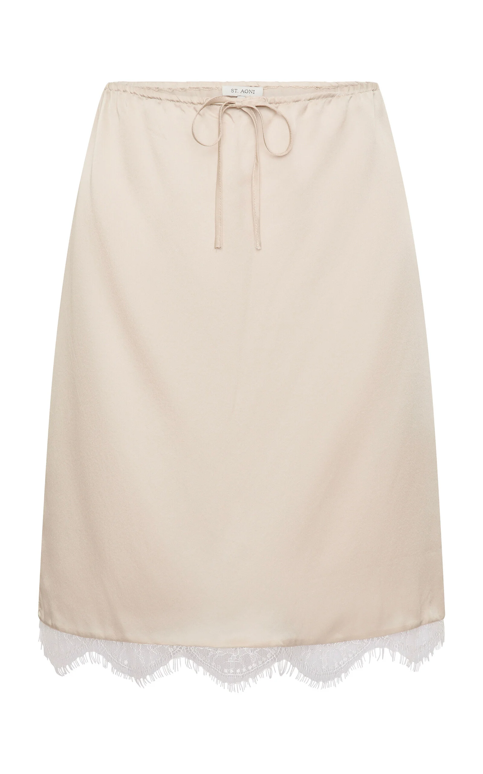 Low rise, knee length, elasticated waistband with self tie, lace trim detail, unlined PRODUCT DETAILS - Spring '26 - Slim fit, low rise, elastic waistband with self tie, lace trim - Unlined - Composition: Skirt: 100% Silk Trim: 100% Nylon - Pulls on - *Dry clean, low iron, do not bleach, soak, or tumble dry - Made in China