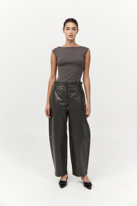The Leather Balloon Pants feature a relaxed, voluminous balloon leg that creates an effortless yet refined shape. Crafted from supple 100% lambskin and lined with TENCEL™ Lyocell for comfort. Pair with the Leather Panelled Shirt for a seamless ensemble that exudes understated luxury in wearable form. DETAILS Materials - 100% Lambskin Leather - Lining: 100% TENCEL™ Lyocell - Leather Working Group (LWG) Certified Garment Details - Crew neckline, concealed magnetic buttons, cocoon silhouette, front and back darts, front flap patch pockets, raglan sleeve with darts, lined Manufacturing - SGS Social Accountability - 8000 Audit Certification - Manufacturer has signed the St. Agni Code of Conduct - Responsibly made in India CARE Natural Leather Protector is recommended before wear. Use a good quality leather conditioner or protective spray to treat the product to increase its durability. Regularly clean leather with a soft brush or cloth, regularly air out leather, and where possible do not get leather wet. Blot away water or moisture as soon as possible, do not immerse leather in water to clean, do not dry wet leather with artificial heat like a radiator or hairdryer, do not machine wash leather, do not tumble dry leather, do not iron leather. Keep out of direct sunlight to avoid fading and avoid wet weather. Marks and variations in the leather are not considered a fault but are inherent to the natural beauty and uniqueness of the leather. When not in use we advise to store your St. Agni product in its protective bag and we recommend to continually treat it with a leather conditioner to keep it hydrated for a long life.