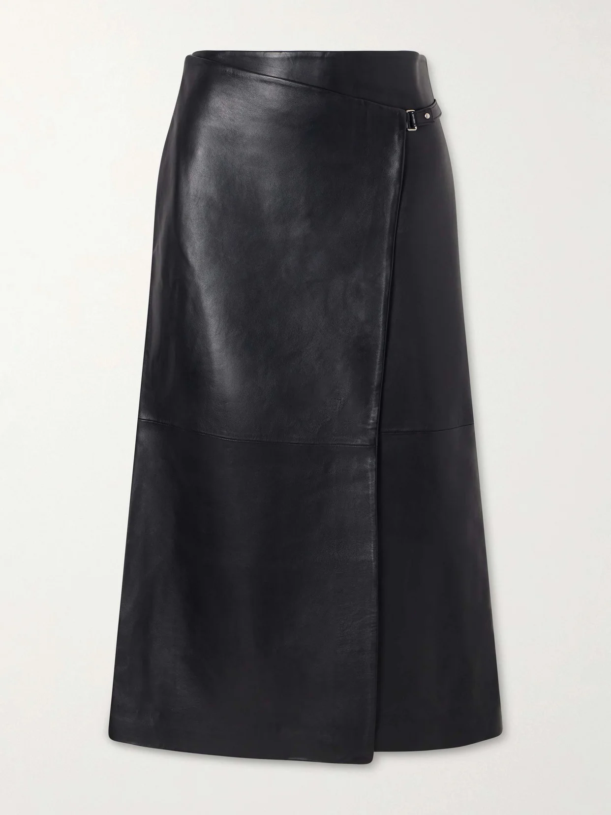 ST. AGNI's wrap maxi skirt is designed with a clean, streamlined silhouette and subtle structure. Crafted from smooth leather, it sits high on the waist and fastens with a minimal wrap detail that creates soft movement through the length. Style it with a simple tank and sandals for understated balance.