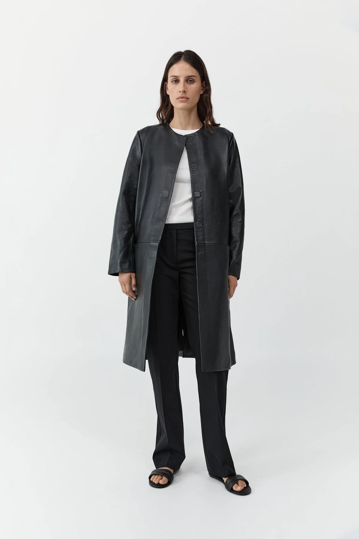 The Leather Minimal Coat is cut to a mid-length silhouette with a clean crew neckline. Subtle panel construction brings structure to the tailored fit, while discreet pockets offer everyday utility. Finished with concealed magnetic buttons for a seamless front, the Leather Minimal Coat is a quietly refined outer layer, designed for longevity. DETAILS Materials - 100% Lambskin Leather - Lining: 100% Lyocell - Leather Working Group (LWG) Certificate - Chrome free dyed Garment Details - Mid length, crew neckline, concealed magnetic buttons, front pockets, panel detail, lined - Tailored fit Manufacturing - SGS Social Accountability 8000 Audit Certification - Manufacturer has signed the St. Agni Code of Conduct - Responsibly made in India CARE - Dry clean only - Spot clean with damp cloth