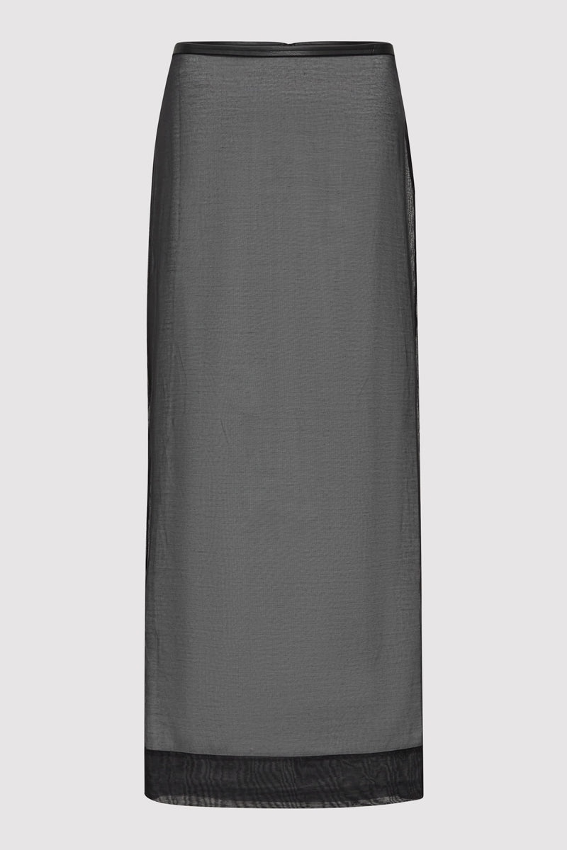 The Sheer Leather Trim Skirt merges fluidity with structure, crafted from an organic cotton and silk blend, its sheer finish is accented by leather trim detailing, offering understated contrast. Cut to a maxi length, the Sheer Leather Trim Skirt features a centre-back invisible zip and a back vent, ensuring ease of movement. Effortlessly elegant and versatile, the Sheer Leather Trim Skirt is perfect for layering or standing alone as a statement piece. DETAILS Materials - 62% Organic Cotton / 38% Silk - Organic Content Standard (OCS) Certificate Garment Details - Mid rise, sheer, leather trim detail, a-line, back vent, centre back invisible zip, maxi length - Relaxed fit Manufacturing - Manufacturer has signed the St. Agni Code of Conduct - Fairwear Audit - OCS Certificate - OEKO-TEX 100 Certification - Responsibly made in China CARE - Dry clean only - Do not bleach - Do not tumble dry - Iron on low temperature