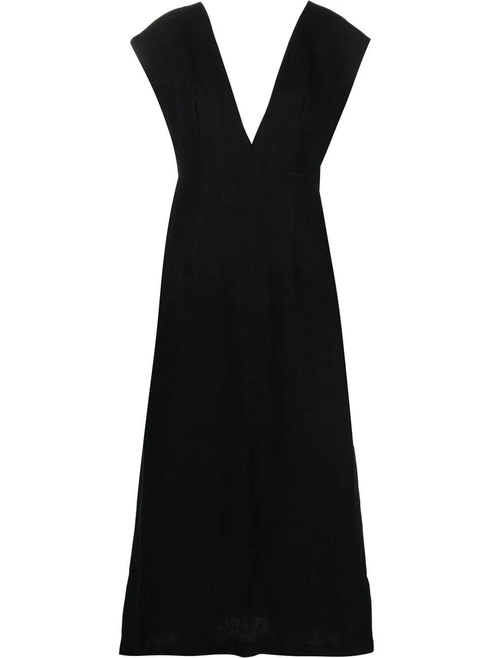 Origami linen midi dress Highlights - Black - Linen - V-neck - Short sleeves - Straight hem Imported Composition Linen/Flax 100% SIZE & FIT Model measurements Height 5 ft 10 in(1.78 m) Bust/Chest 33.07 in(84 cm) Hips 35.82 in(91 cm) Waist 25.98 in(66 cm) FittingInformation This piece fits true to size. We recommend you get your regular size Made with a mid-weight non-stretch fabric Washing instructions Dry Clean Only