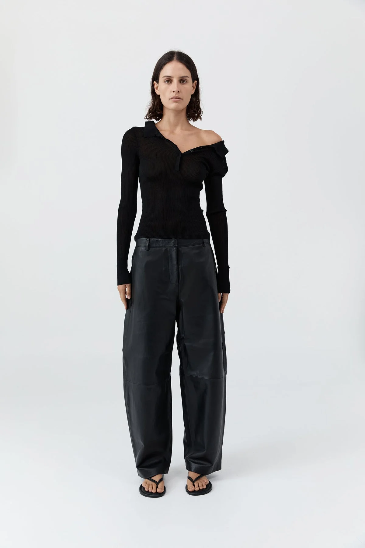 A refined essential for everyday wear, the Petit Polo Knit Top features a semi sheer ribbed body that softly contours. Effortlessly versatile and endlessly wearable, it is finished with a button detail at the back neck, allowing it to be styled off-shoulder. An understated basic, the Petit Polo Knit Top offers a modern twist on the classic polo. DETAILS Materials - 74% TENCEL™ Lyocell / 26% Naia™ Acetate - LENZING™ Certificate - NAIA™ Certificate Garment Details - Long sleeves, pointed collar, front and back concealed button placket, ribbed collar and cuffs, semi-sheer ribbed body - Slim fit Manufacturing - SMETA Sedex Ethical Audit - ISO 9001 Management System Certificate - HIC ISO 14005 Environmental Management System Certificate - HIC ISO 45001 Occupational Health & Safety Management System Certificate - Manufacturer has signed the St. Agni Code of Conduct - R - esponsibly made in China CARE - Wash and dry garment turned inside out - Cool hand wash separately in mild detergent - Do not soak - Do not bleach - Do not twist or wring - Do not tumble dry - Dry flat in shade - Ease into shape - Cool iron on reverse side - Do not hang, store flat - Do not dry clean (X)